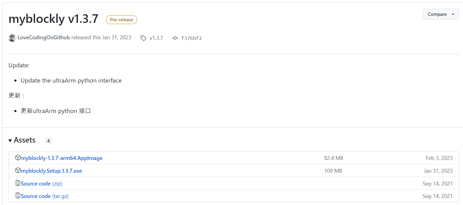 다운로드 링크 : https://github.com/elephantrobotics/myblockly-package/releases/tag/v1.3.7