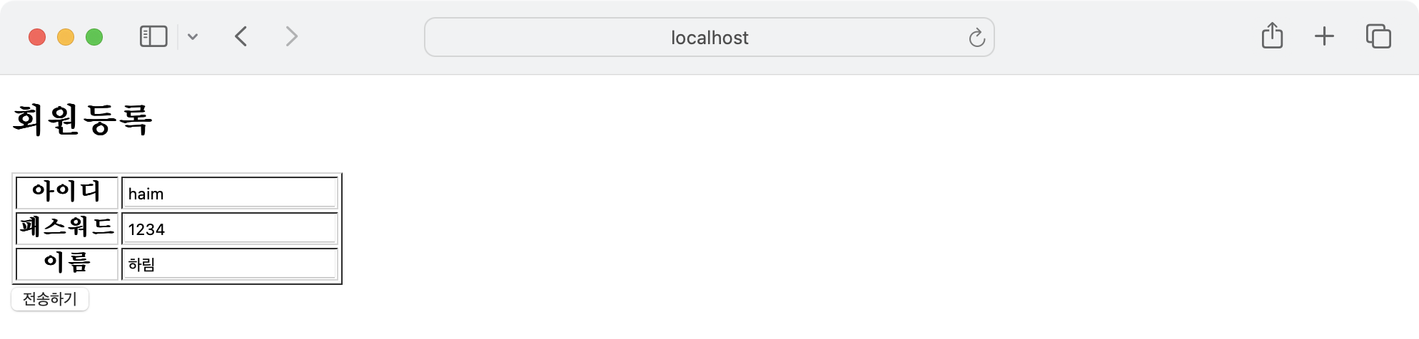 입력한 후 '전송하기' 버튼을 클릭하면 회원정보가 등록된 후 회원목록 페이지로 이동합니다. 목록에서 회원정보가 정상적으로 등록되었음을 확인할 수 있습니다.