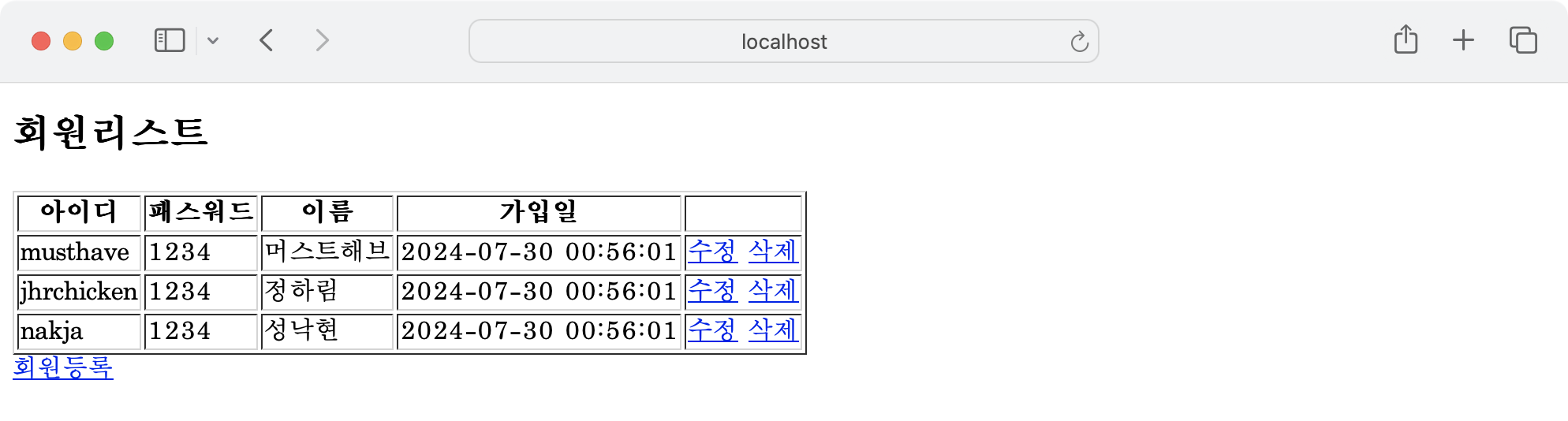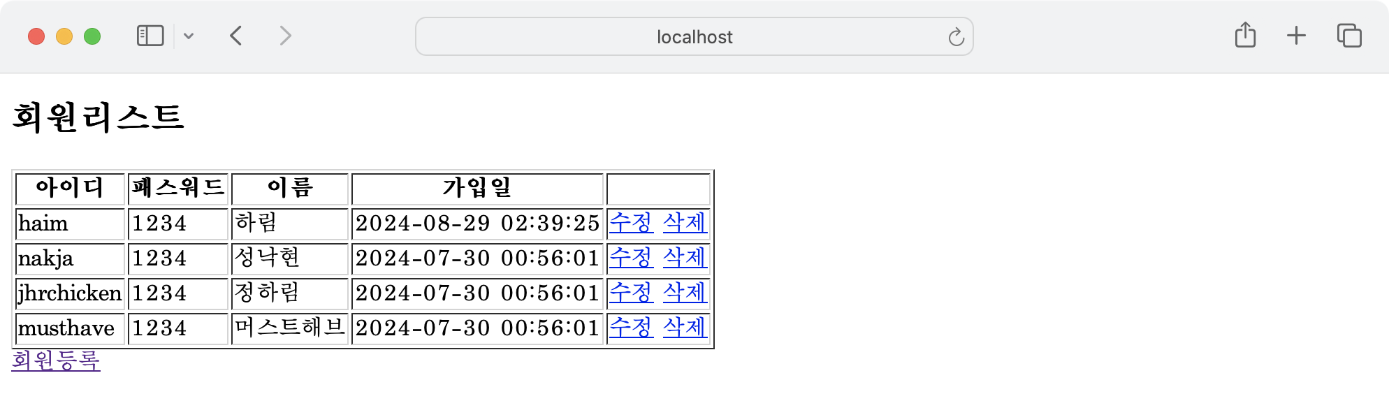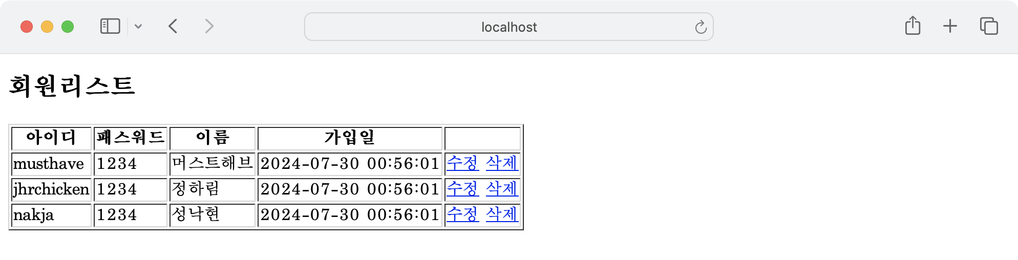 수정할 회원의 '삭제' 링크를 클릭하면 회원 정보가 삭제된 후 회원목록 페이지로 이동합니다. 목록에서 회원정보가 정상적으로 삭제되었음을 확인할 수 있습니다.