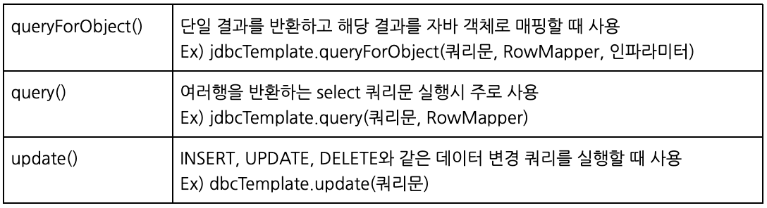 JdbcTemplate의 주요 메서드는 다음과 같습니다.