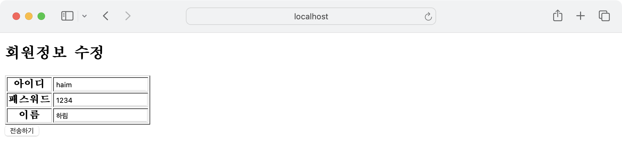 수정할 회원의 '수정' 링크를 클릭하여 수정할 정보를 입력합니다.