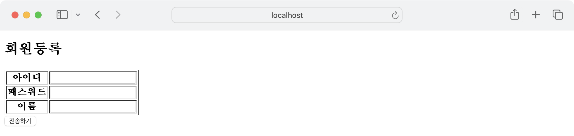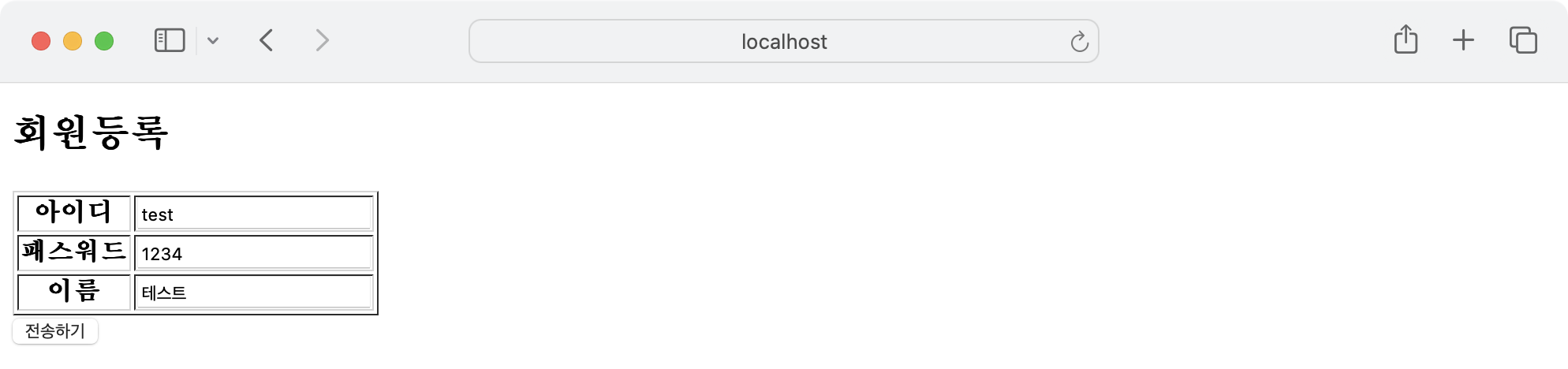 입력한 후 '전송하기' 버튼을 클릭하면 회원정보가 등록된 후 회원목록 페이지로 이동합니다. 목록에서 회원정보가 정상적으로 등록되었음을 확인할 수 있습니다.