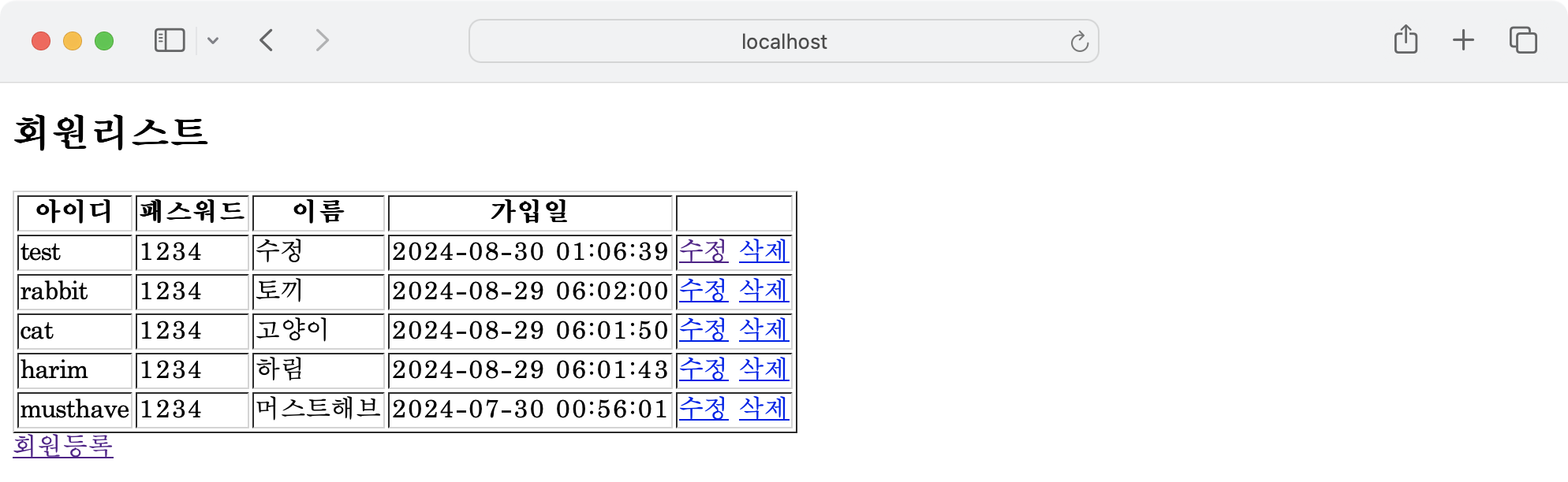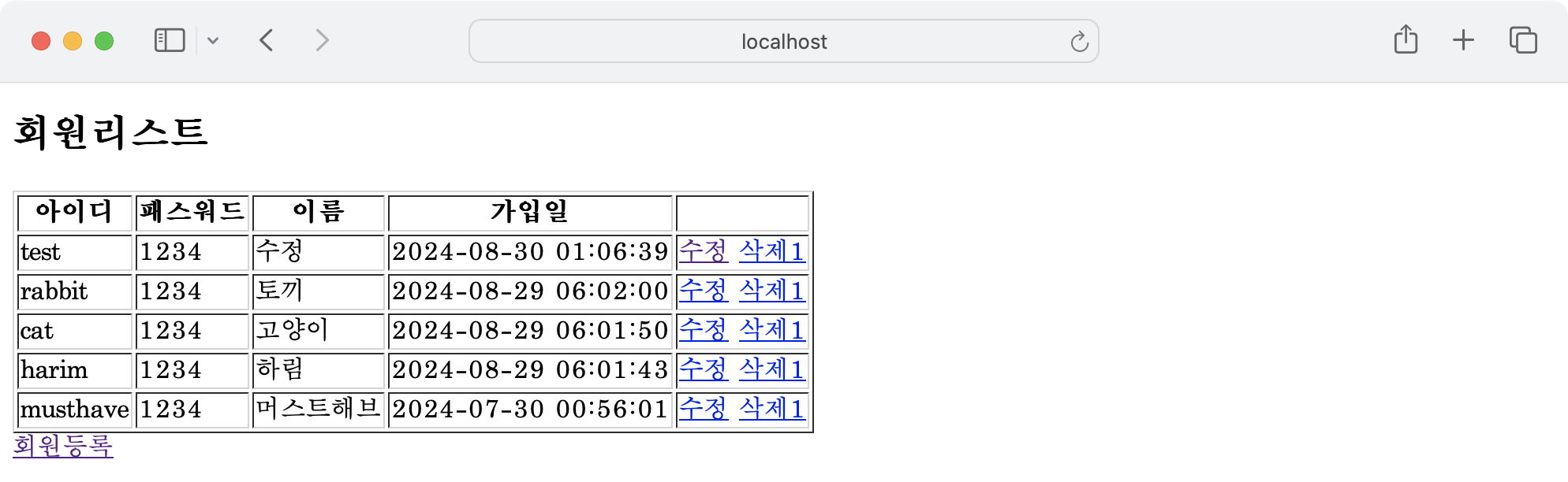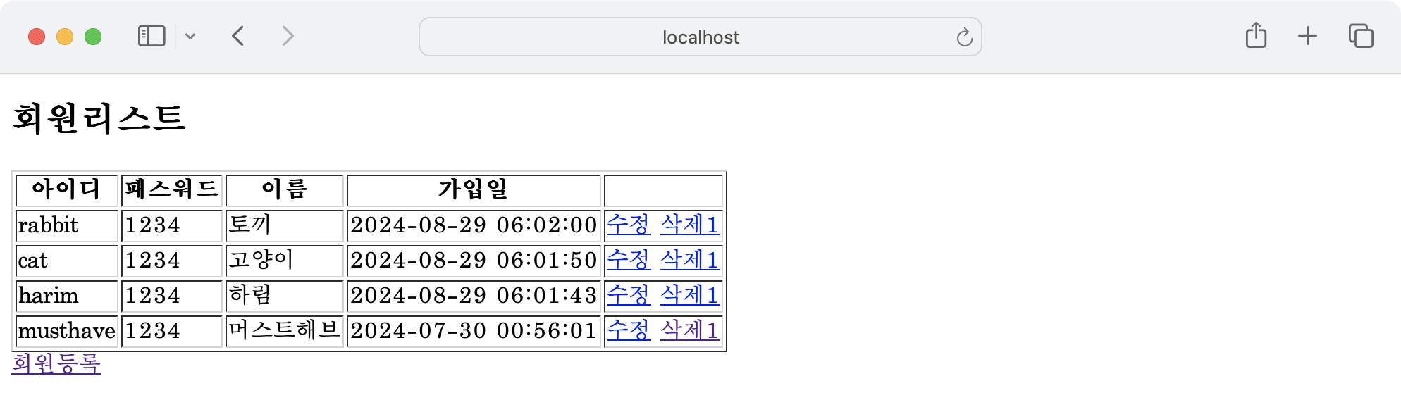 수정할 회원의 '삭제' 링크를 클릭하면 회원 정보가 삭제된 후 회원목록 페이지로 이동합니다. 목록에서 회원정보가 정상적으로 삭제되었음을 확인할 수 있습니다.
