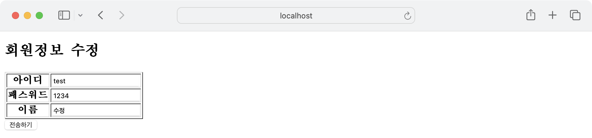 수정할 회원의 '수정' 링크를 클릭하여 수정할 정보를 입력합니다.