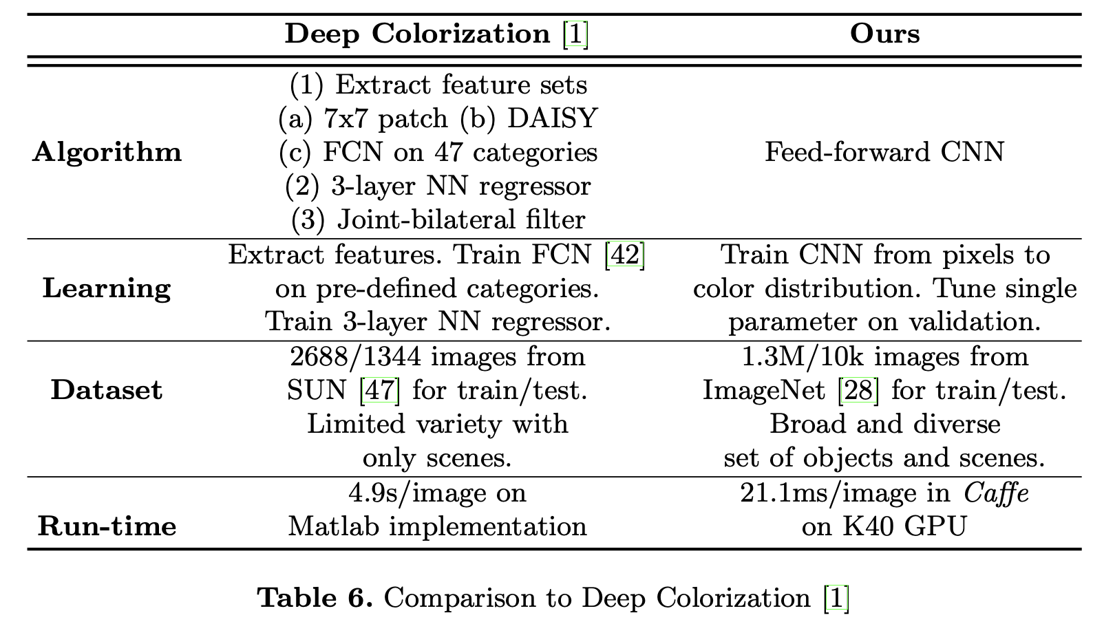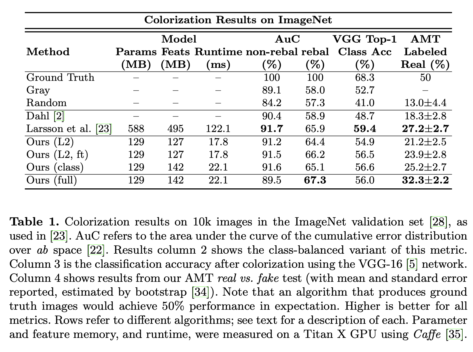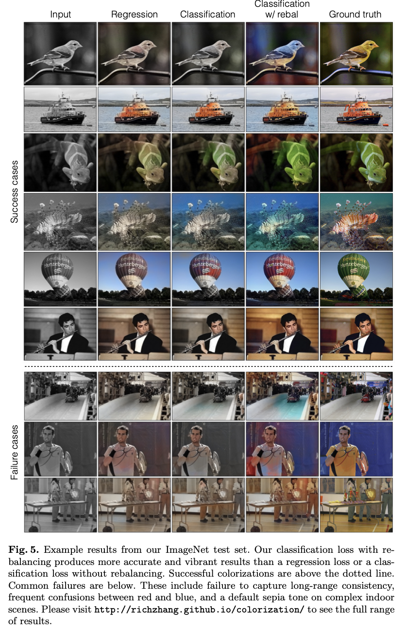 - 결과에 colors의 다양성을 증가하기 위해 학습 시간에서 class-rebalancing의 사용과 a classification task로 근본적인 불확실성을 포옹함.