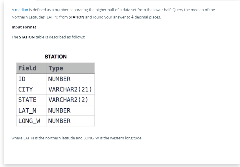 select ROUND(LAT_N,4) from ( SELECT LAT_N ,PERCENT_RANK() OVER (ORDER BY LAT_N) p_rnk from station ) t WHERE p_rnk =0.5