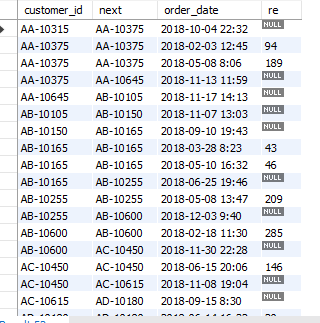 ,CASE WHEN customer_id = lead(customer_id) over (ORDER BY customer_id, order_date) THEN datediff(lead(order_date) over (ORDER BY customer_id, order_date) , order_date) ELSE null END as re