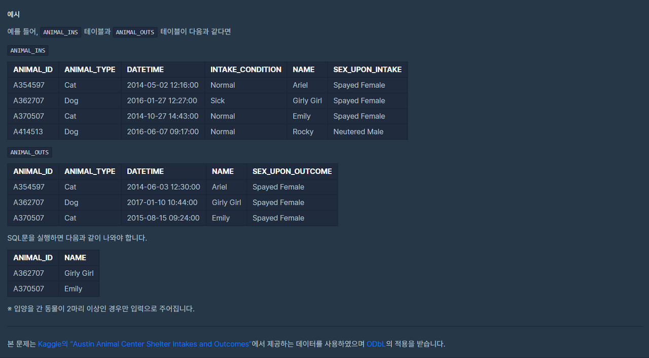 FROM ANIMAL_INS A JOIN ANIMAL_OUTS B ON A.ANIMAL_ID = B.ANIMAL_ID