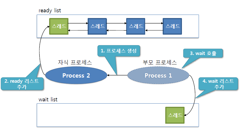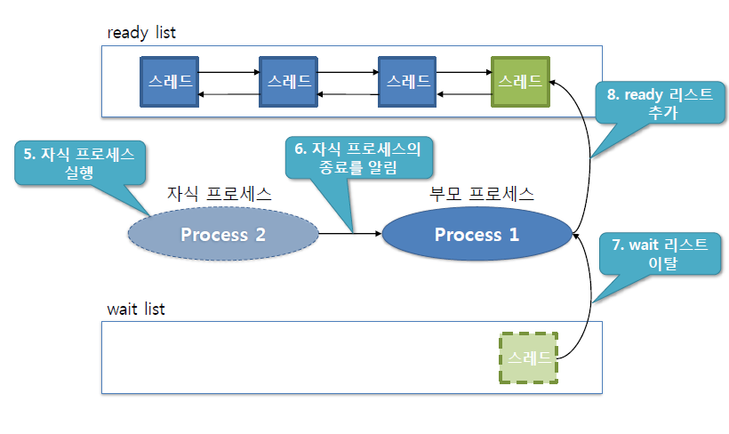 /* wait_sema 를 이용하여 자식 프로세스가 종료할때까지 대기함. 종료 상태를 저장 */