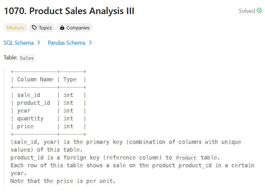 SELECT product_id, year first_year, quantity, price FROM Sales WHERE (product_id, year) IN (SELECT product_id, min(year) FROM Sales GROUP BY product_id)