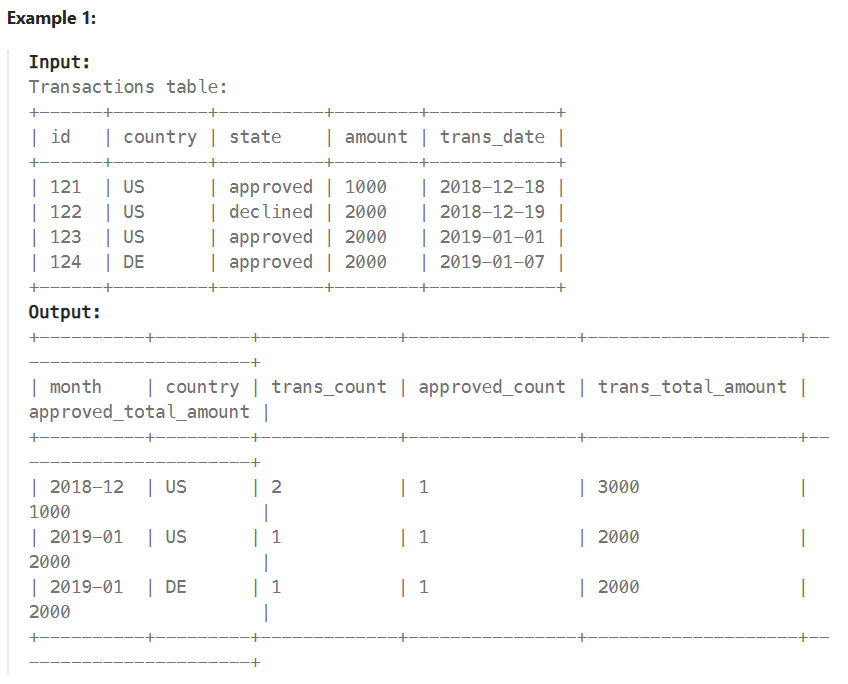 SELECT DATE_FORMAT(trans_date, "%Y-%m") month, country, COUNT(trans_date) trans_count,