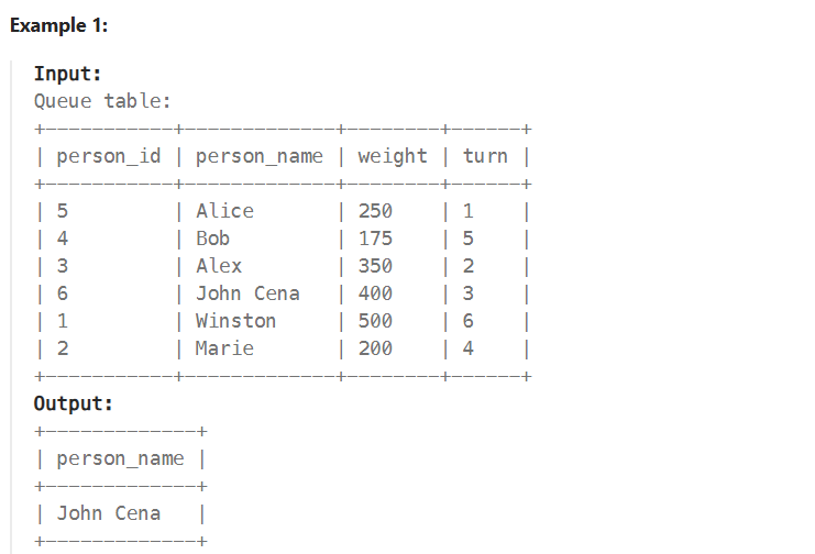 SELECT person_name FROM Queue q1 WHERE 1000 >= ( SELECT SUM(weight) FROM Queue q2 WHERE q2.turn <= q1.turn )ORDER BY turn DESC LIMIT 1;