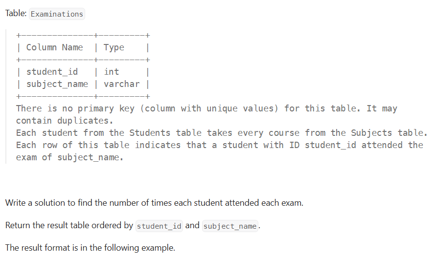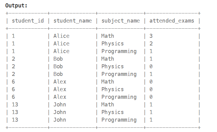SELECT A.student_id, A.student_name, B.subject_name, COUNT(E.subject_name) attended_exams
