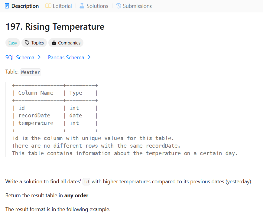SELECT w1.id FROM Weather w1, Weather w2 WHERE DATEDIFF(w1.recordDate, w2.recordDate) = 1 AND w1.temperature > w2.temperature