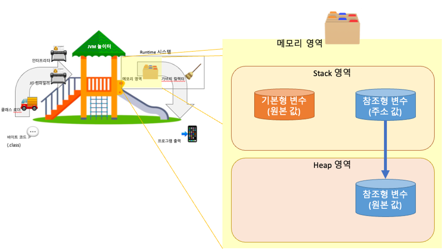 - 참조형 - 참조형 변수 = 주솟값을 저장하는 '주소형 변수' - 저장 관점에서 차이점 - 기본형 변수 : 원본 값이 Stack 영역에 있습니다. - 참조형 변수 : 원본 값이 Heap 영역에 있습니다.