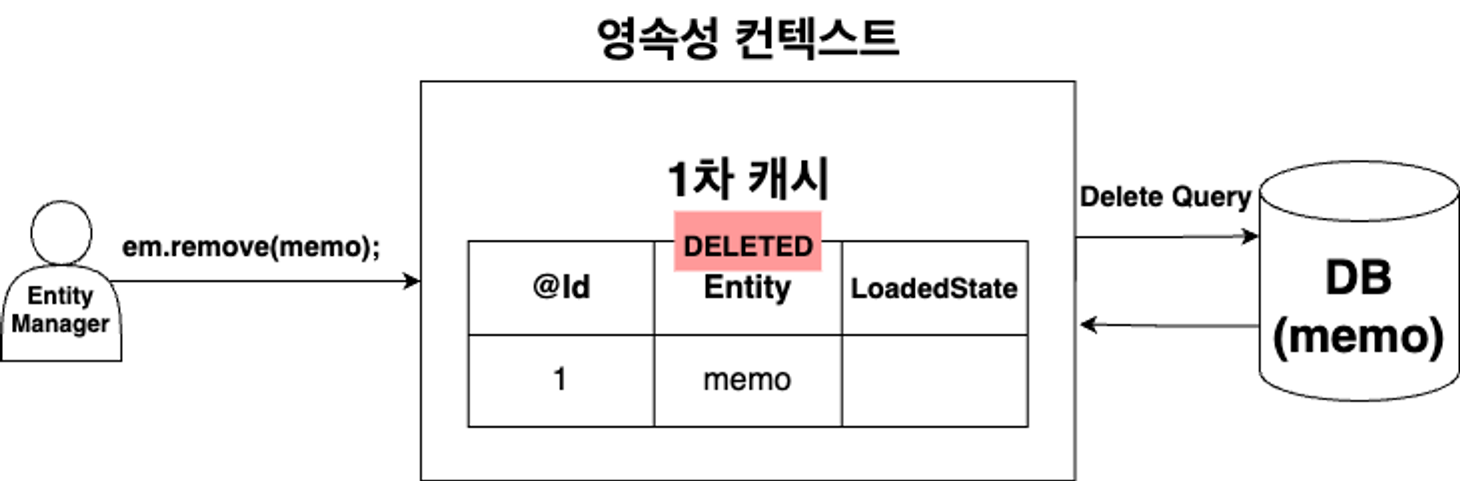 em.remove(memo); 호출 시 삭제할 Entity를 DELETED 상태로 만든 후 트랜잭션 commit 후 Delete SQL이 DB에 요청