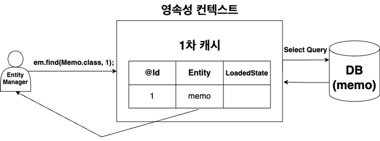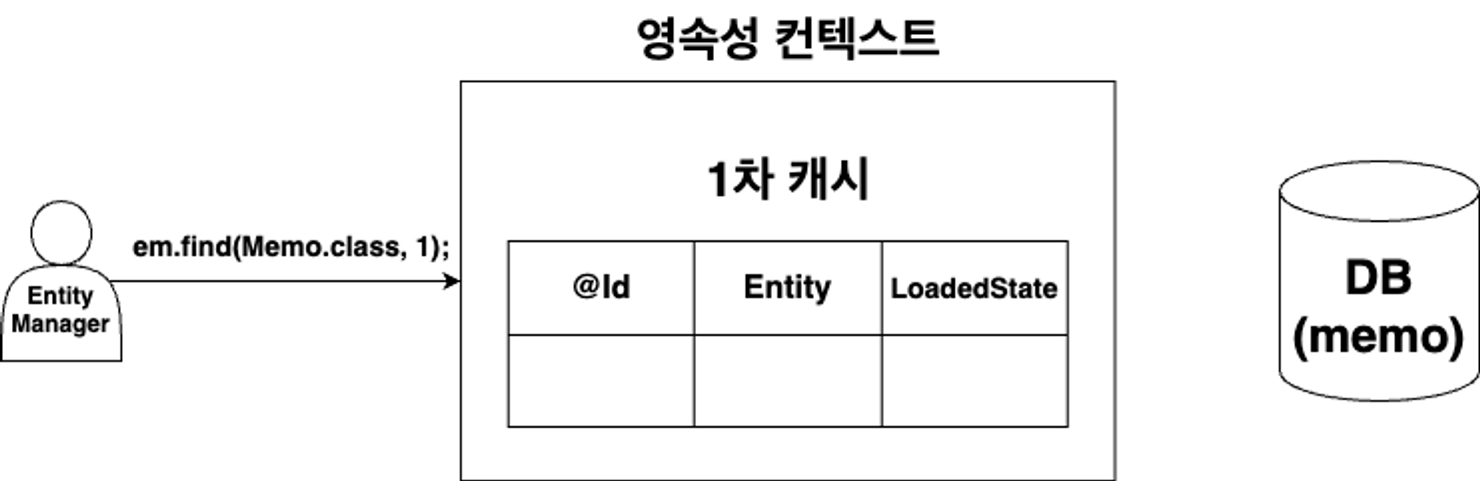 em.find(Memo.class, 1); 호출 시 캐시 저장소에 식별자 값이 1이면서 Memo Entity 타입인 값이 있는지 조회