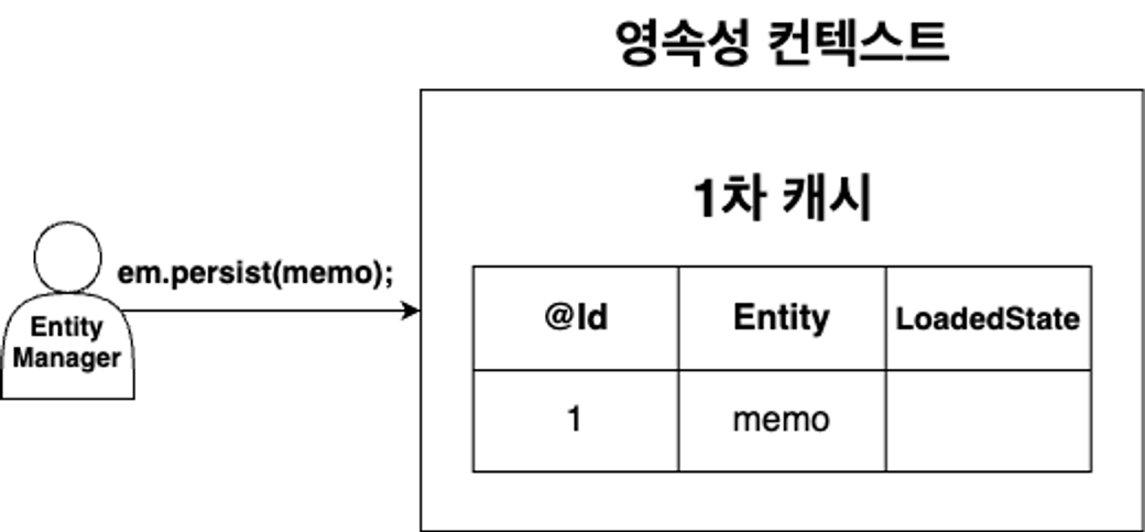 em.persist(memo) : 메서드가 호출되면 memo Entity 객체를 캐시 저장소에 저장