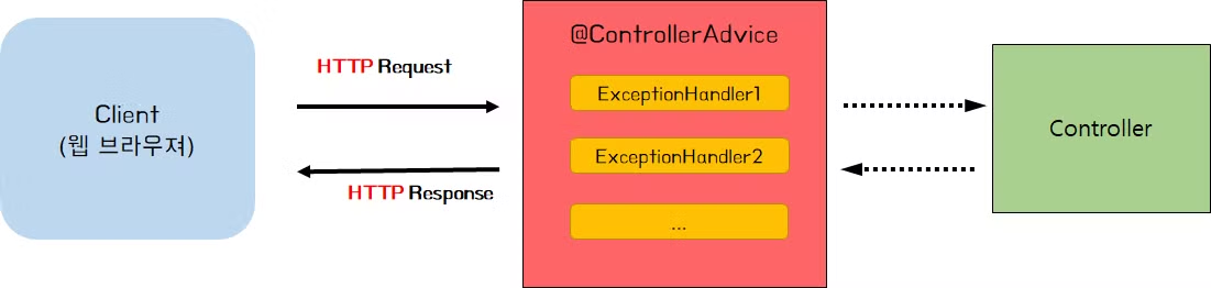 @ControllerAdvice@ControllerAdvice는 Spring에서 예외처리를 위한 클래스 레벨 애너테이션@ControllerAdvice 가 붙은 클래스에서는 @ExceptionHandler메서드를 정의하여 예외를 처리하는 로직을 담을 수 있다.@ControllerAdvice 를 사용하는 이유?@ControllerAdvice를 사용하면 예외 처리 로직을 모듈화하여 관리하기 쉽기 때문에, 팀 내에서 공통된 예외 처리 로직을 공유하거나 다른 팀에서 예외 처리를 참고할 수 있다. 이를 통해 개발 생산성을 향상시키는 것도 가능.@RestControllerAdvice