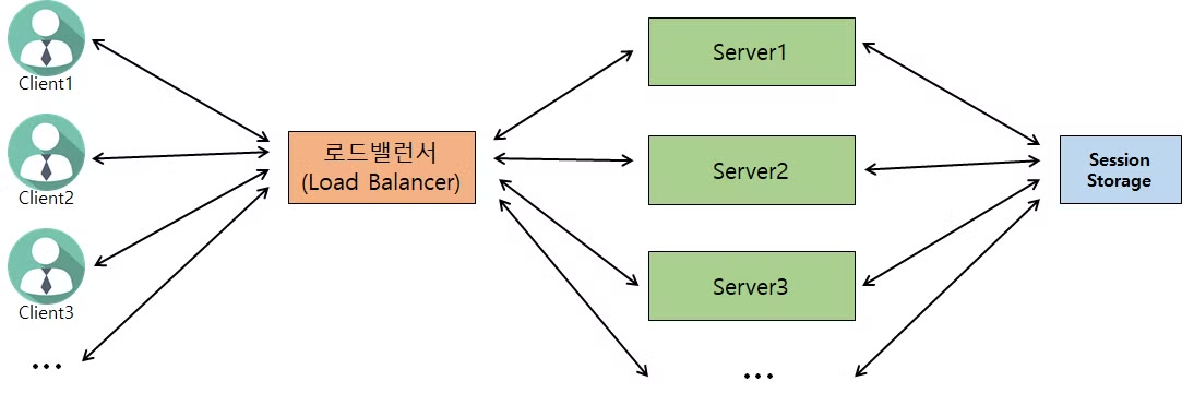 - Session storage 가 모든 Client 의 로그인 정보 소유하고 있기 때문에 모든 서버에서 모든 Client의 API 요청을 처리