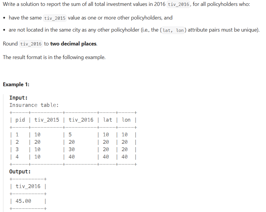 SELECT ROUND(SUM(tiv_2016), 2) tiv_2016 FROM Insurance WHERE tiv_2015 IN ( SELECT tiv_2015 FROM Insurance GROUP BY 1 HAVING COUNT(*) > 1 ) AND (lat, lon) IN ( SELECT lat, lon FROM Insurance GROUP BY 1, 2 HAVING COUNT(*) = 1 )