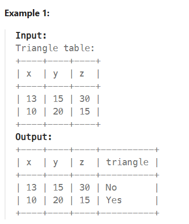 SELECT x, y, z, CASE WHEN x + y > z AND x + z > y AND y + z > x THEN 'Yes' ELSE 'No' END 'triangle' FROM Triangle