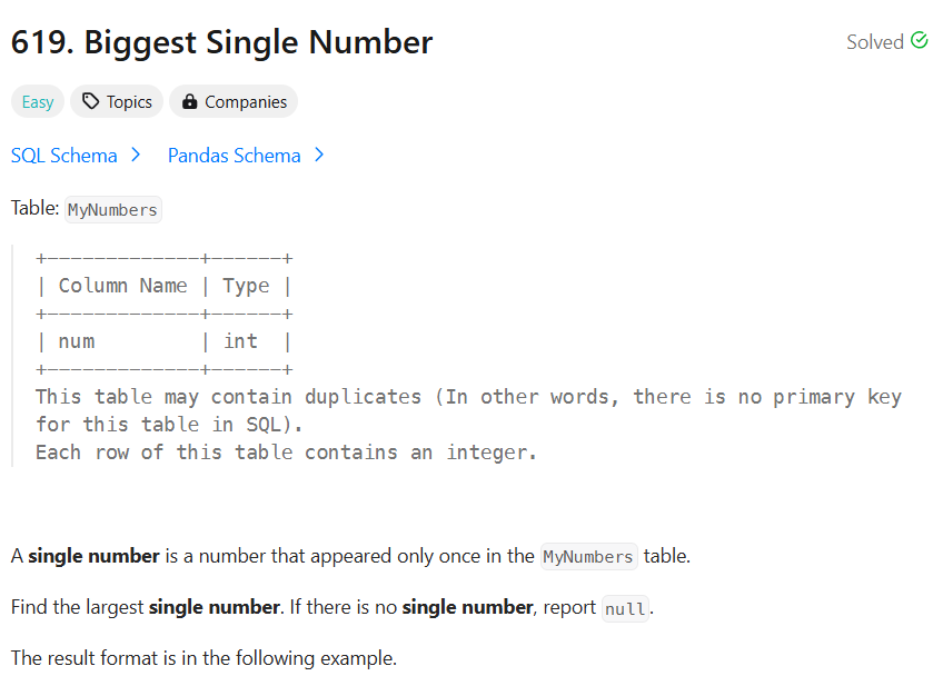 SELECT MAX(num) num FROM (SELECT num FROM MyNumbers GROUP BY num HAVING COUNT(*) = 1) AS unique_nums;