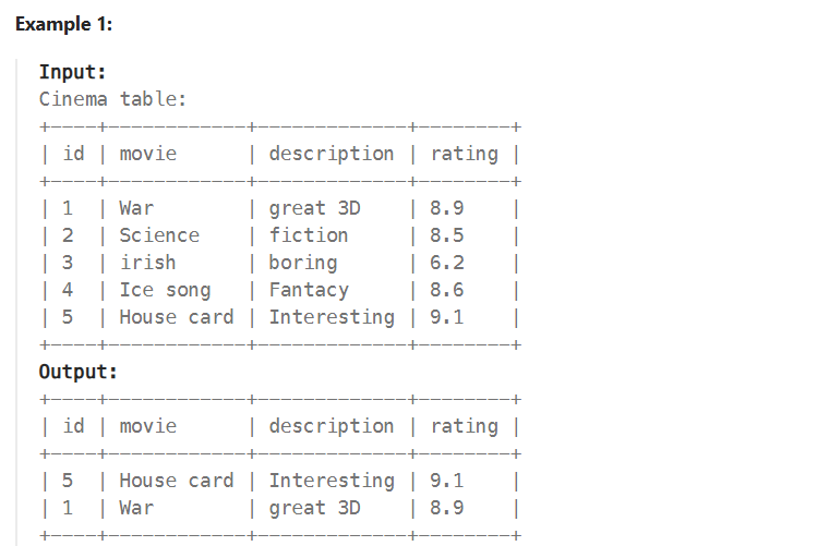 SELECT id, movie, description, rating FROM Cinema WHERE MOD(id, 2) = 1 AND description != 'boring' ORDER BY 4 DESC
