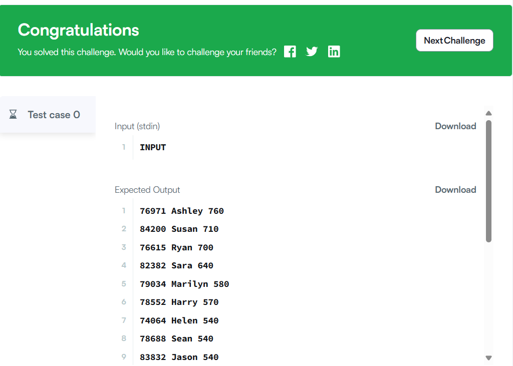 SELECT hacker_id, challenge_id, MAX(score) AS max_score
