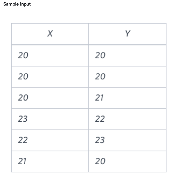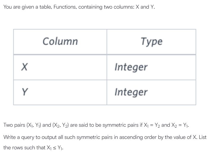 SELECT A.X, A.Y FROM Functions A JOIN Functions B ON A.X = B.Y AND A.Y = B.X GROUP BY A.X, A.Y HAVING COUNT(A.X) > 1 OR A.X < A.Y ORDER BY A.X;