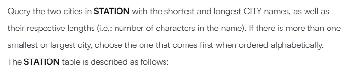 SELECT CITY AS city_name, LENGTH(CITY) AS city_length FROM STATION WHERE CITY = ( SELECT CITY FROM STATION ORDER BY LENGTH(CITY) ASC, CITY ASC LIMIT 1 ) OR CITY = ( SELECT CITY FROM STATION ORDER BY LENGTH(CITY) DESC, CITY ASC LIMIT 1 );