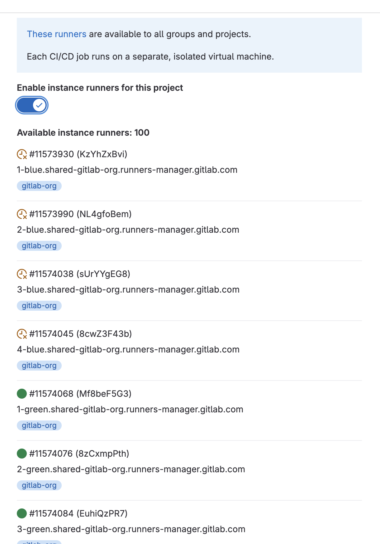 - 의심 가는 부분은 gitlab에서 무료로 제공하는 intance runner 이다. 이유는 모르겠지만, 환경 변수로 전달하면서 아래 러너들이 동시에 트리거 되는 문제가 발생했다. 비활성화하면 더 이상 충돌 문제가 발생하지 않는다.