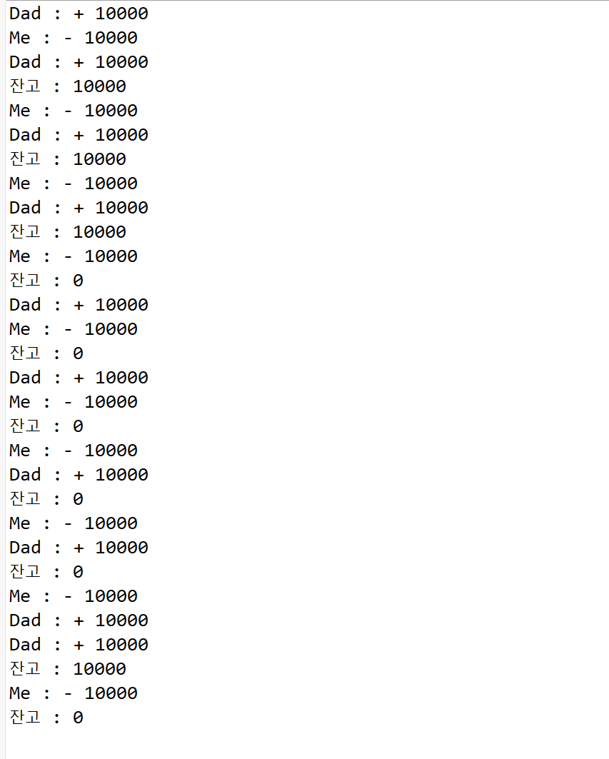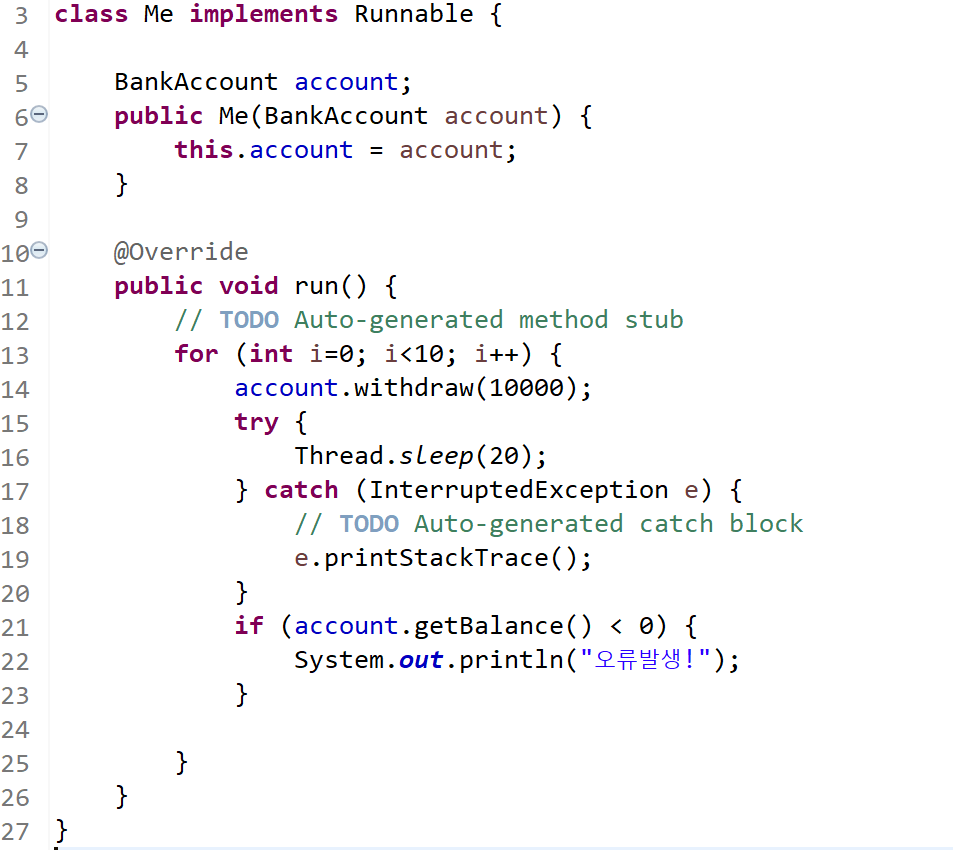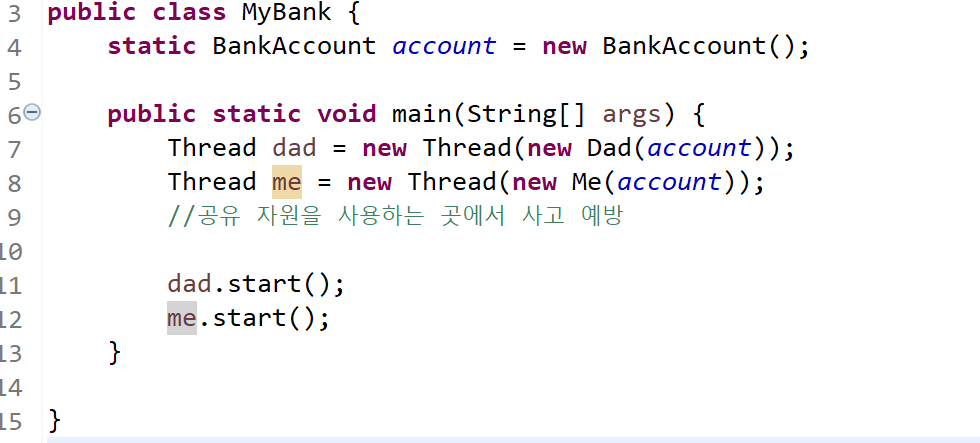 한 계좌에 여러 쓰레드가 동시에 호출할 수는 있지만 처리는 한번에 하나씩 되도록 함 -> 하나의 쓰레드가 공유 데이터를 사용하면 다른 쓰레드는 사용하지 못하게 함
