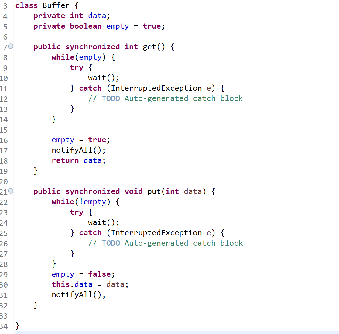 empty가 true라면 wait( )를 호출하고 잠듬 -> notifyAll( ) 신호를 받고 깨어났을 때, 순간적으로 다른 쓰레드가 먼저 채가서 다시 상태가 변했을 수도 있음 -> 조건 재확인!!