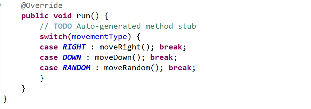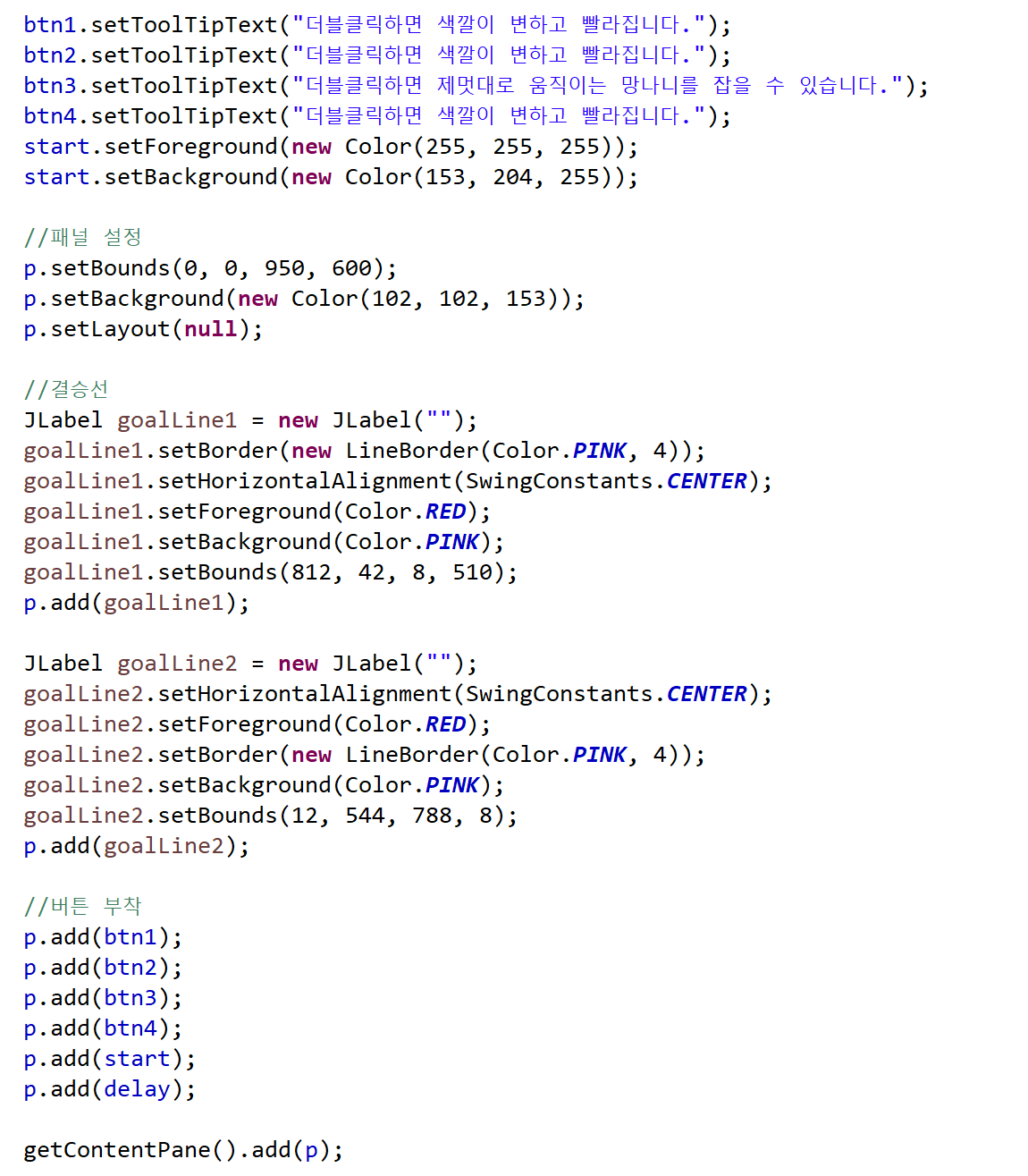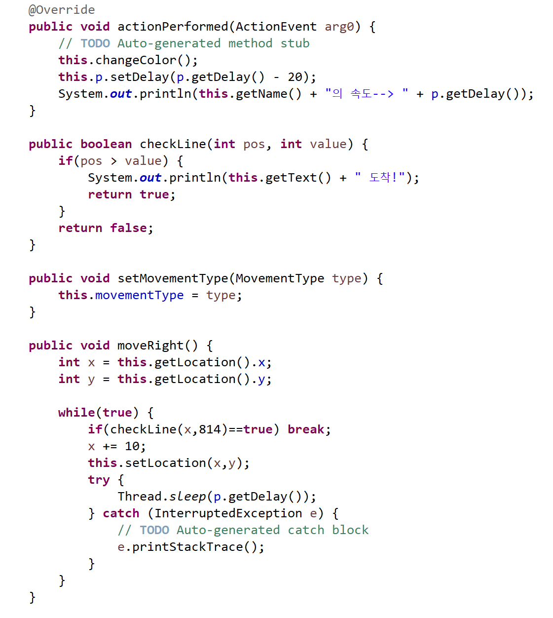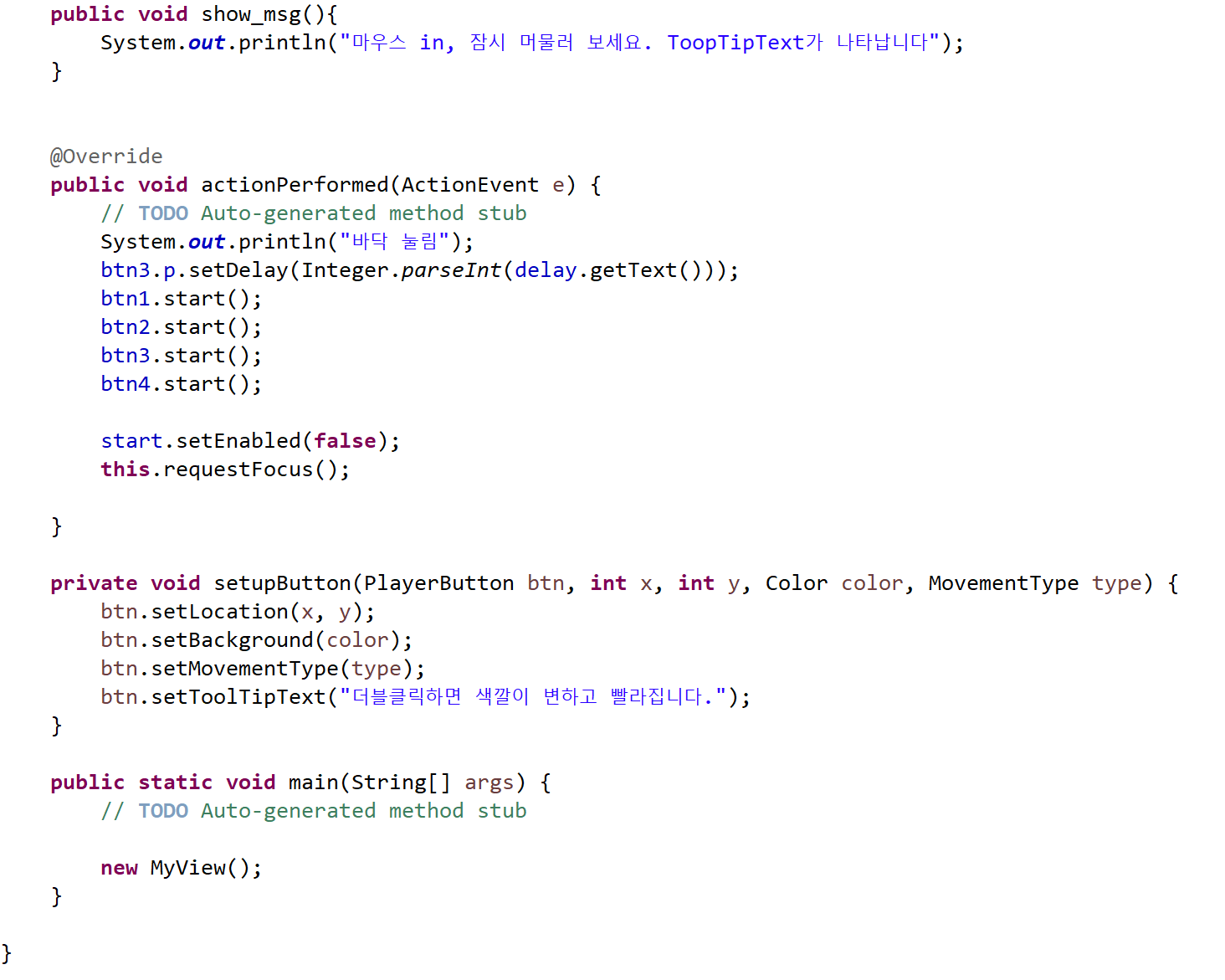이 맥락으로, setSize는 모든 플레이어의 버튼의 크기가 동일하기 때문에 PlayerButton에, setLocation은 MovementType에 따라 설정할 것이기 때문에 PlayerButton 클래스 내부에서 이동 로직을 별도의 메소드로 분리하여 관리한다.