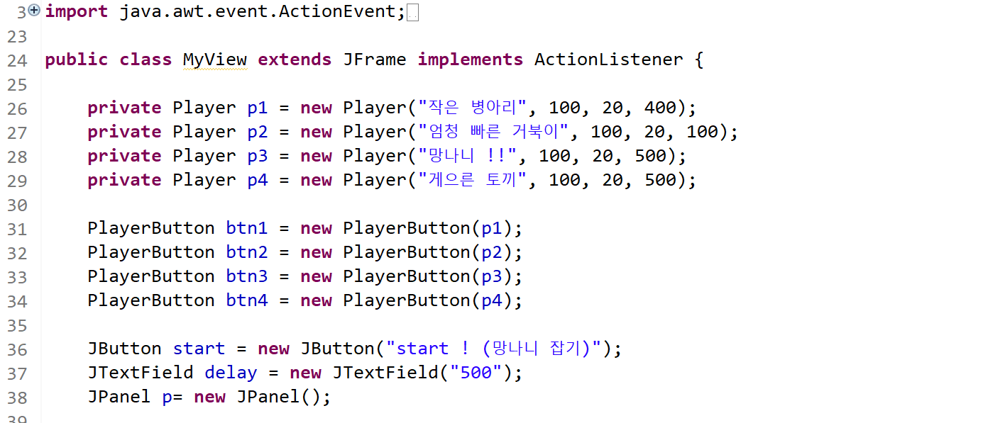 3. 플레이어 버튼들은 윈도우빌더로 만들지 말고, 직접 소스 코드에서 bt1 = new PlayerButton(p1); 처럼 추가하기