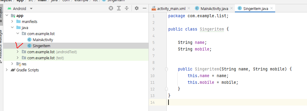 따라서 java>com.exmaple.list에 SingerItem 자바 파일을 만들어준다.