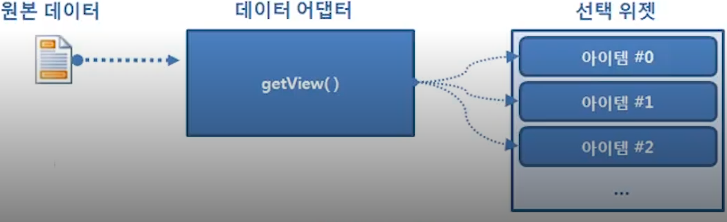 여러개 아이템 중에서 하나를 선택하는 방식의 선택위젯은 어댑터를 사용해야 한다.