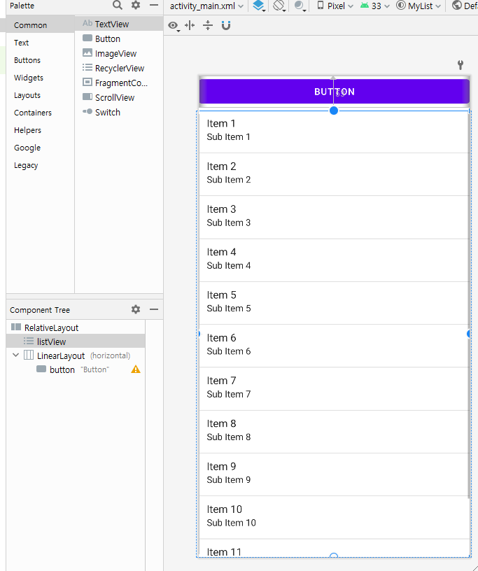 먼저 activity_main.xml에 버튼과 리스트뷰를 하나씩 만들어준다.