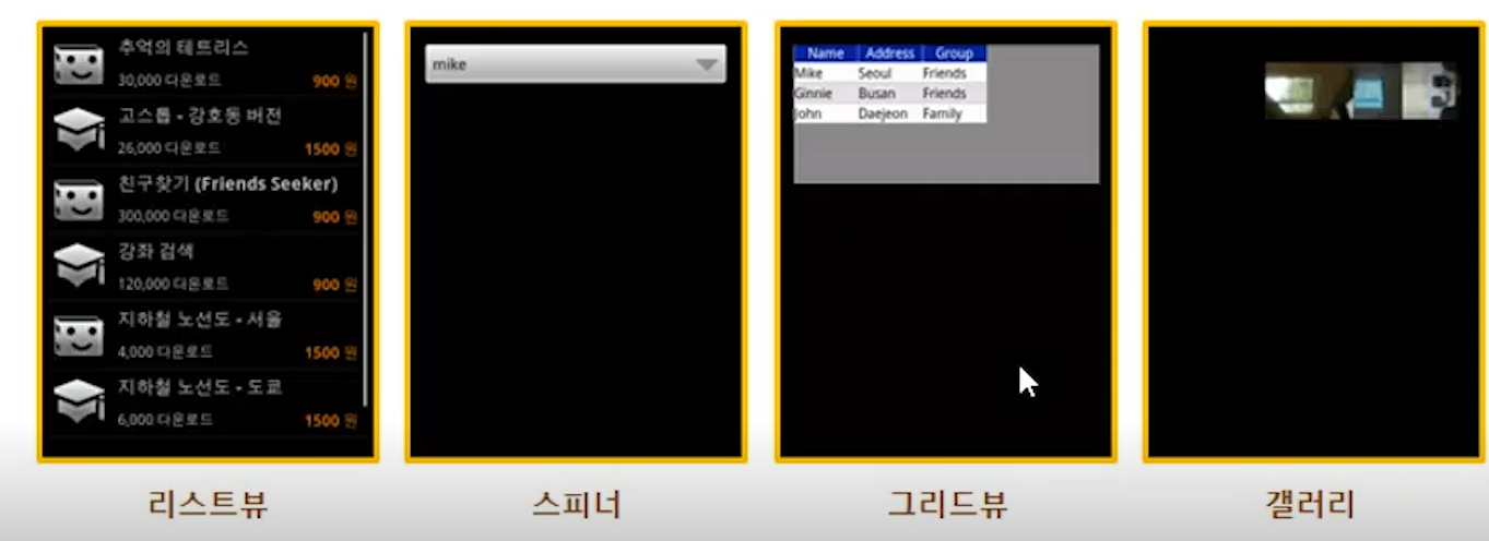안드로이드에서 제공하는 대표적인 선택 위젯들은 어댑터를 사용한다.