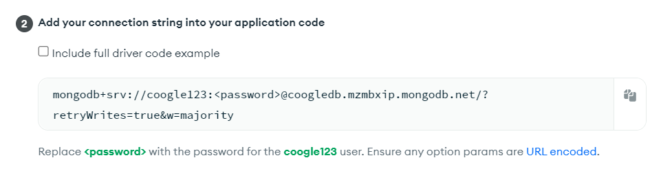 이거 복사해서 쓰면됨. 클러스터 만들고 세팅할 때 user랑 pw 정하는데 그 때 유저이름이 coogle123이고 pw를 password 에 넣어주면된다.