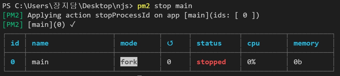 pm2 stop main 하자 stopped로 상태가 변경됨