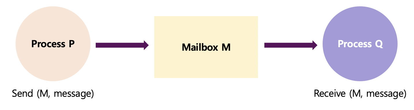 : mailbox 또는 port(커널에 존재함)를 통해 메시지를 간접적으로 전달