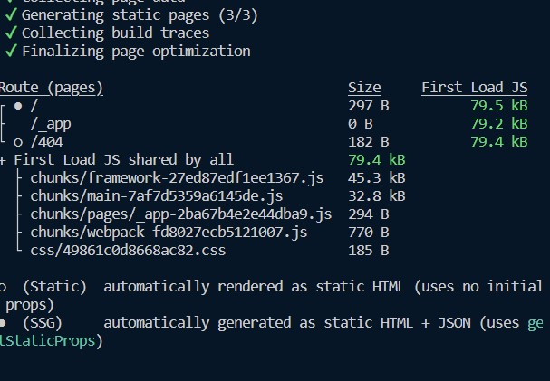 빌드 시 이렇게 정적 페이지가 몇 개 생성되고 있는지 확인할 수 있고, (404 페이지는 기본적으로 생성된답니다)