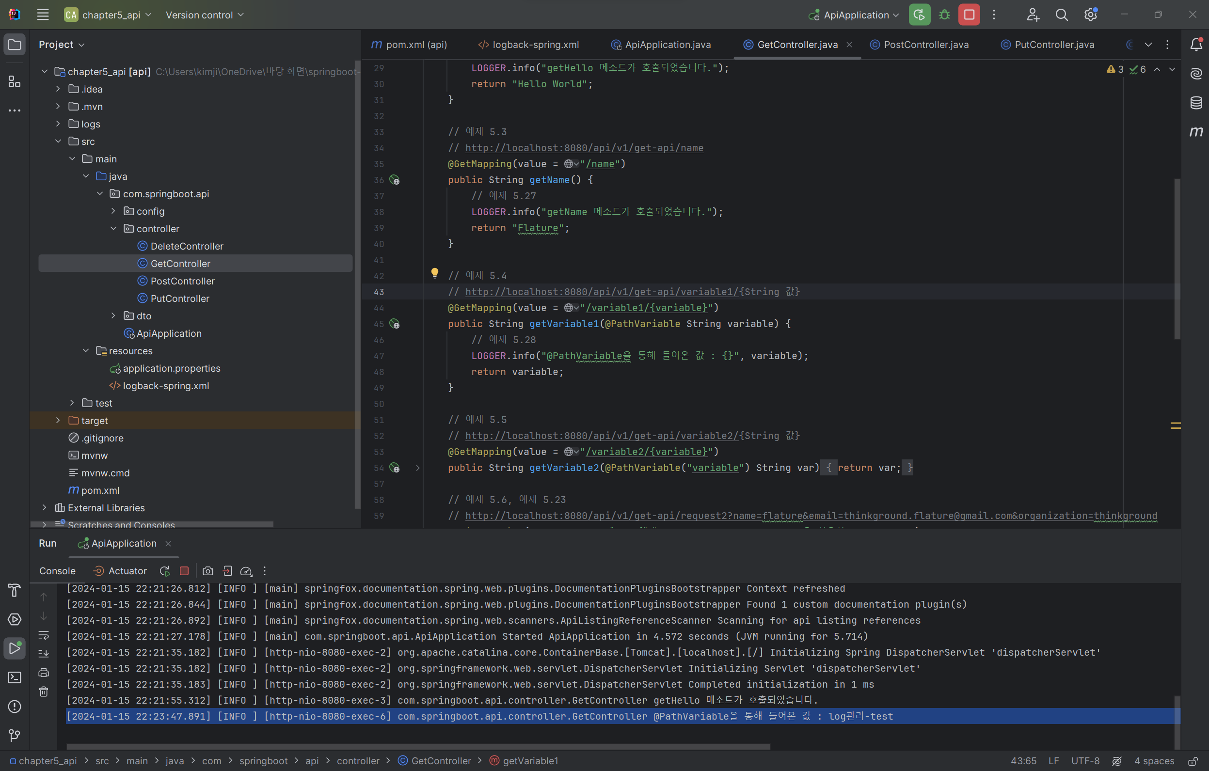 LOGGER.info("@PathVariable을 통해 들어온 값 : {}", variable);를 통해서 변수의 값을 로그로 출력할 수도 있다.