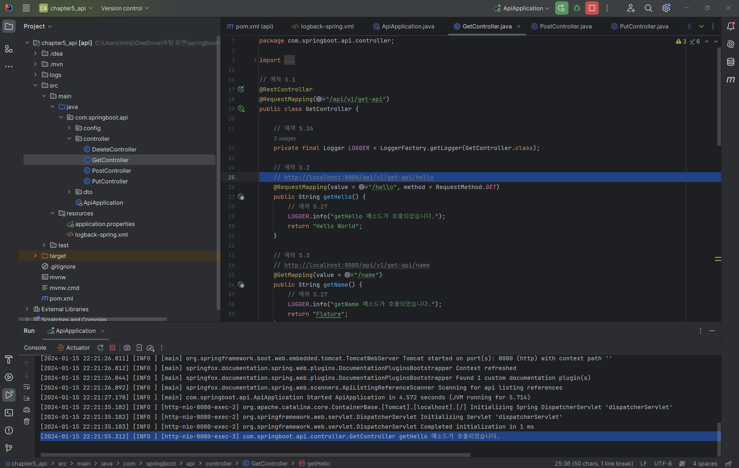 다음과 같이 메서드에서 LOGGER.info("getHello 메소드가 호출되었습니다.");로 로그를 출력할 수 있다.