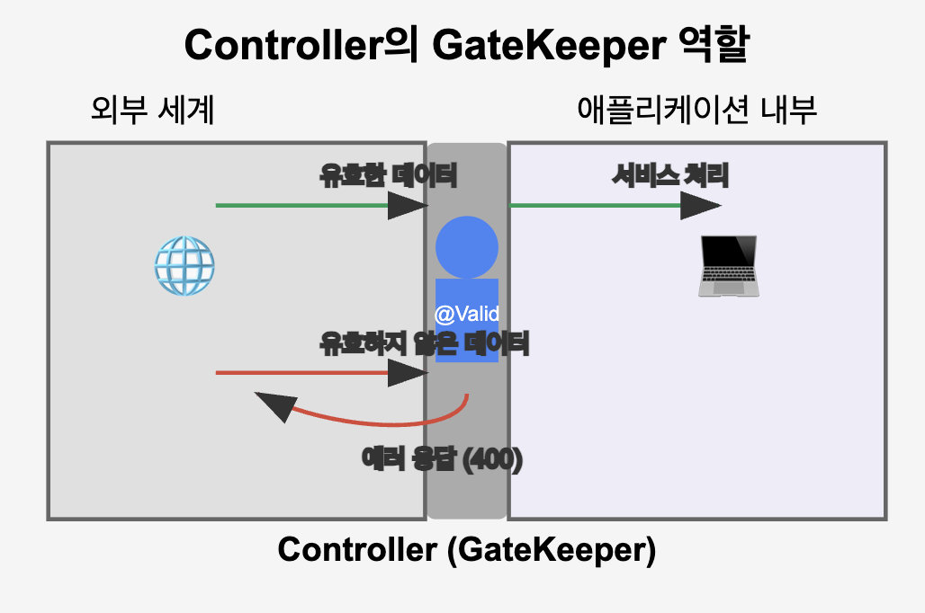 Controller를 Gate Keeper로 사용하기 위해서는 Spring Web MVC의 기술로Method 레벨에 @Valid 어노테이션 할당과 Jakarta Bean Validation 라이브러리를 활용하여 쉽게 검증을 구현할 수 있습니다: