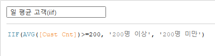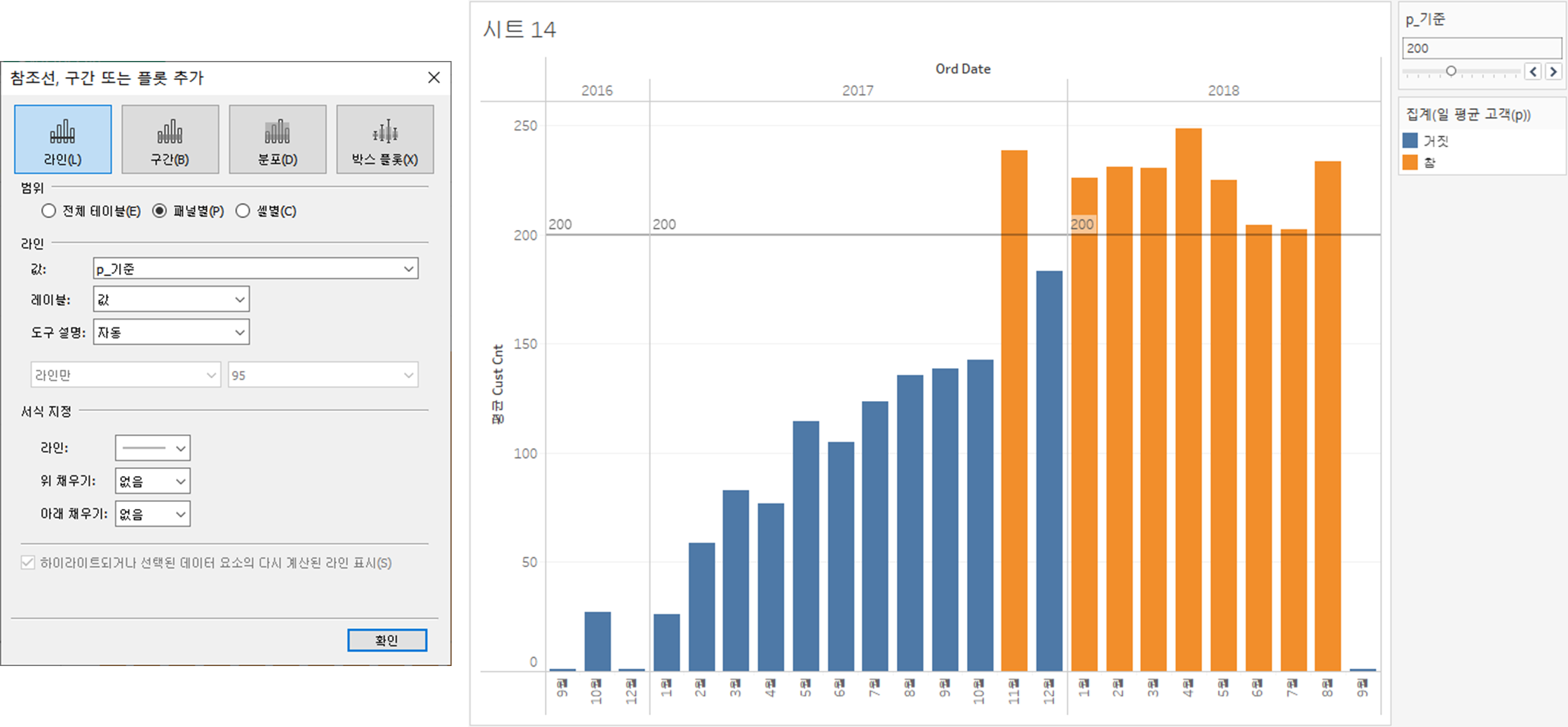 cust cnt, ord date 더블 클릭 > 막대 그래프 생성 > cust cnt는 평균으로 변경계산된 필드 생성 후 색상에 추가