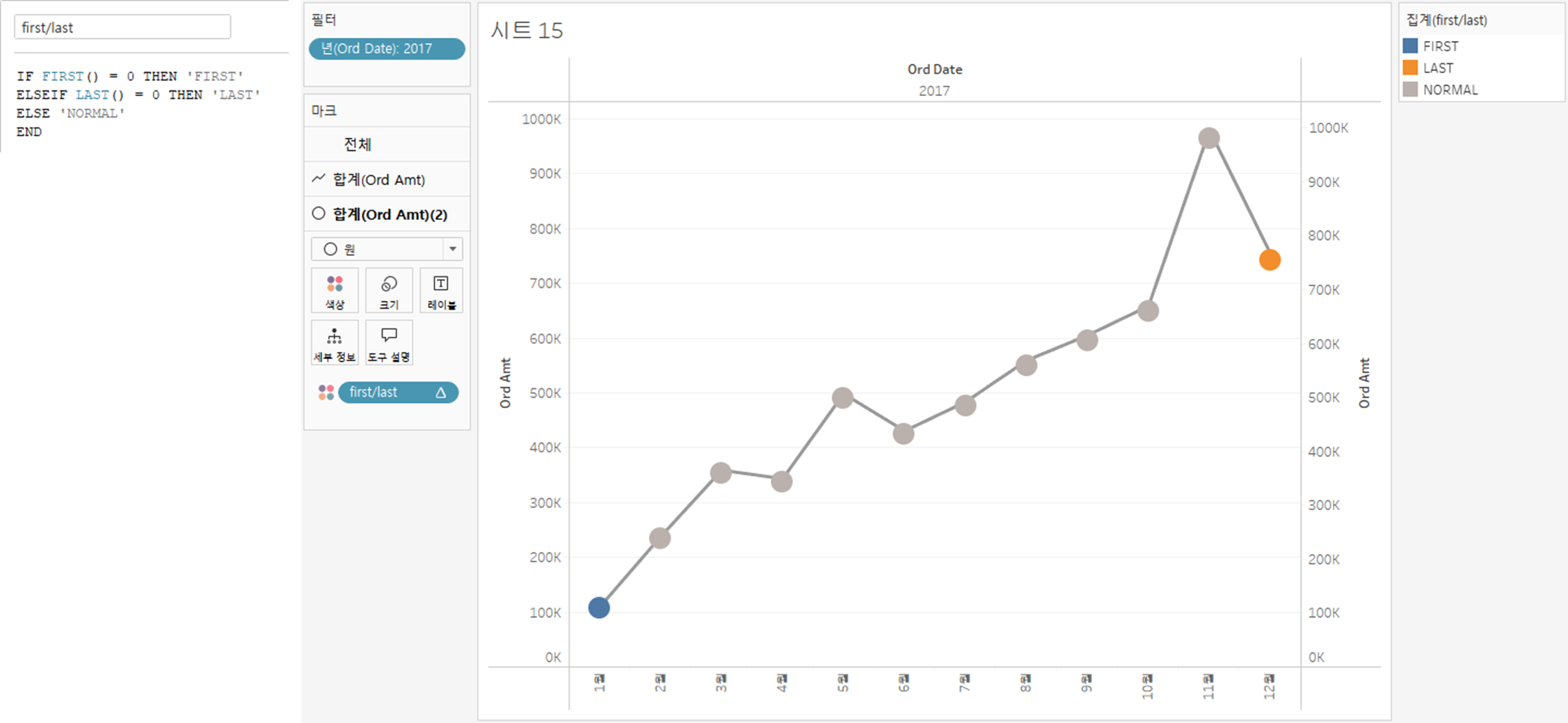 FIRST() = 0 : 첫 행과의 거리가 0LAST() = 0 : 마지막 행과의 거리가 0라인 + 원 그래프 생성 후 계산된 필드 생성