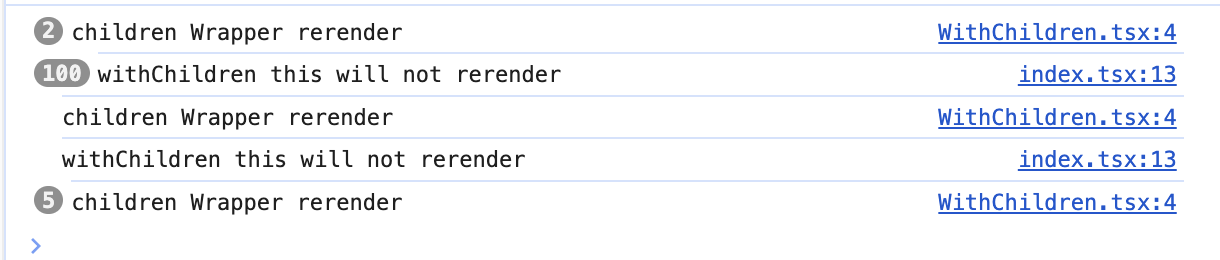 위의 코드에서 children의 핵심은, children을 소비하는 Card 컴포넌트가 children이 jsx라는 것밖에 모른다는 것이다.(arbitrary JSX) 즉 wrapper에서는 이미 완성된 jsx Avatar 컴포넌트를 받을 뿐이기 때문에 wrapper가 rerender 조건을 충족해도 prop으로 받는 jsx가 같다면 children은 rerender 하지 않는다.